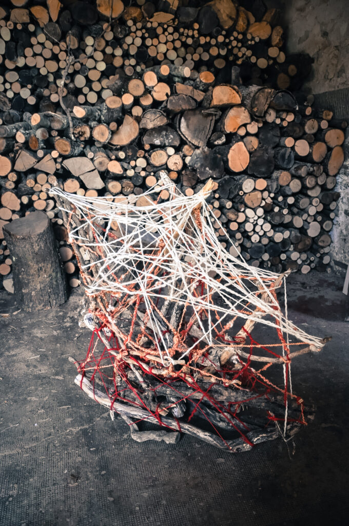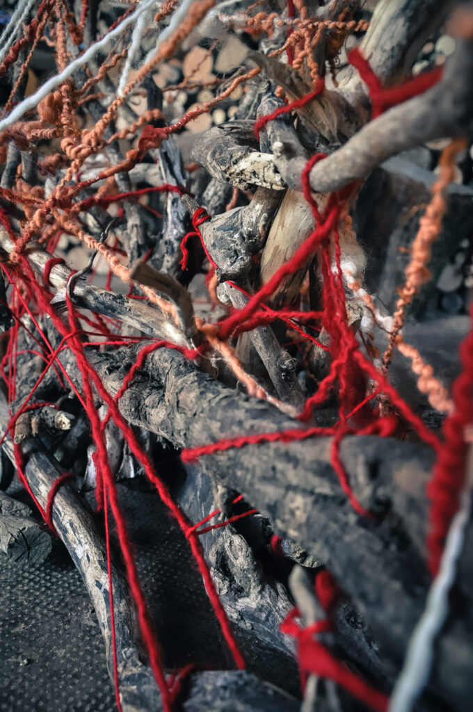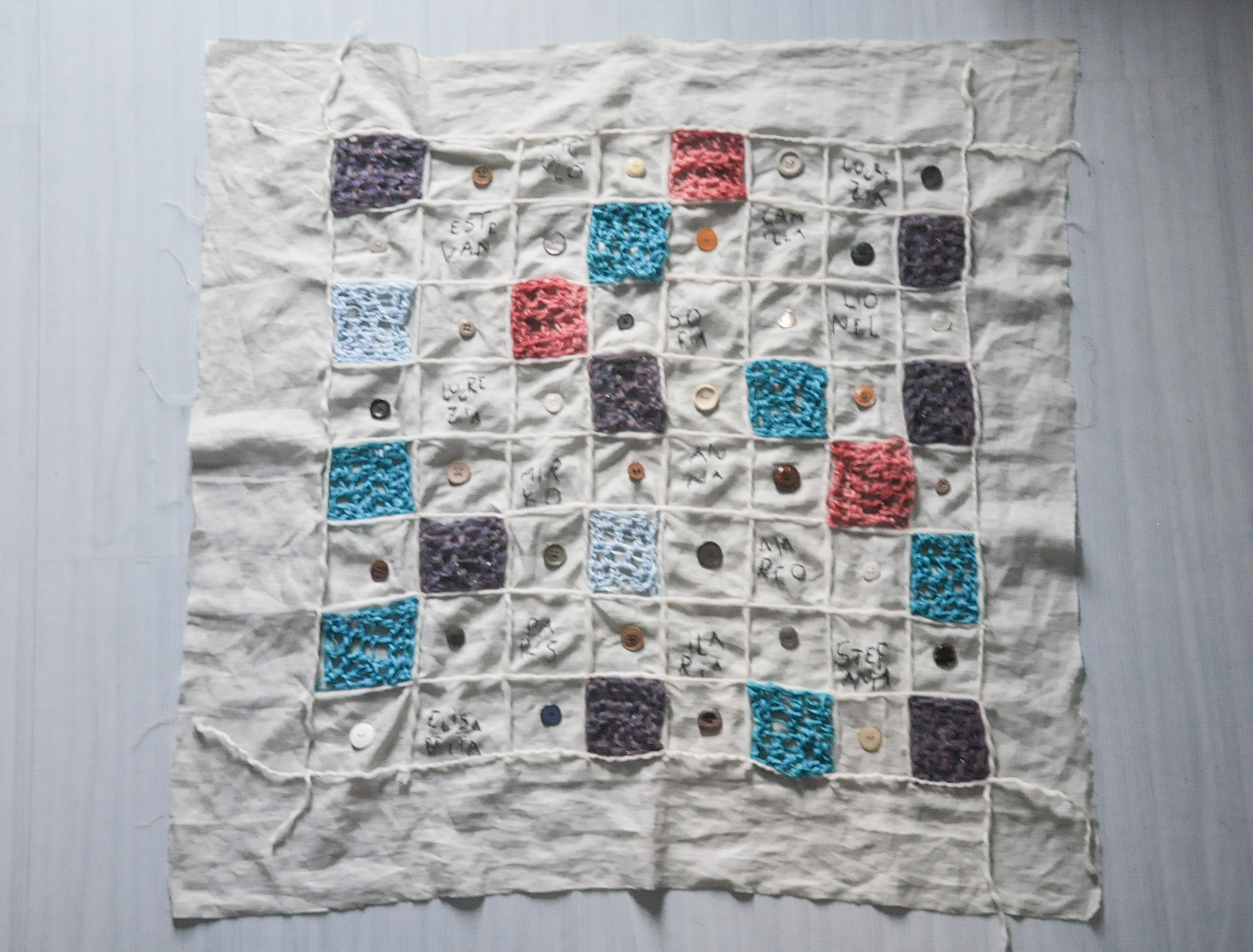 L’opera è stata realizzata durante la residenza artistica “Silente” ispirandosi al gioco che per eccellenza viene svolto in silenzio, quello degli scacchi. Bottoni, ricami e lavoro all’uncinetto si combinano diventando una scacchiera con i nomi di tutti i partecipanti all’esperienza.