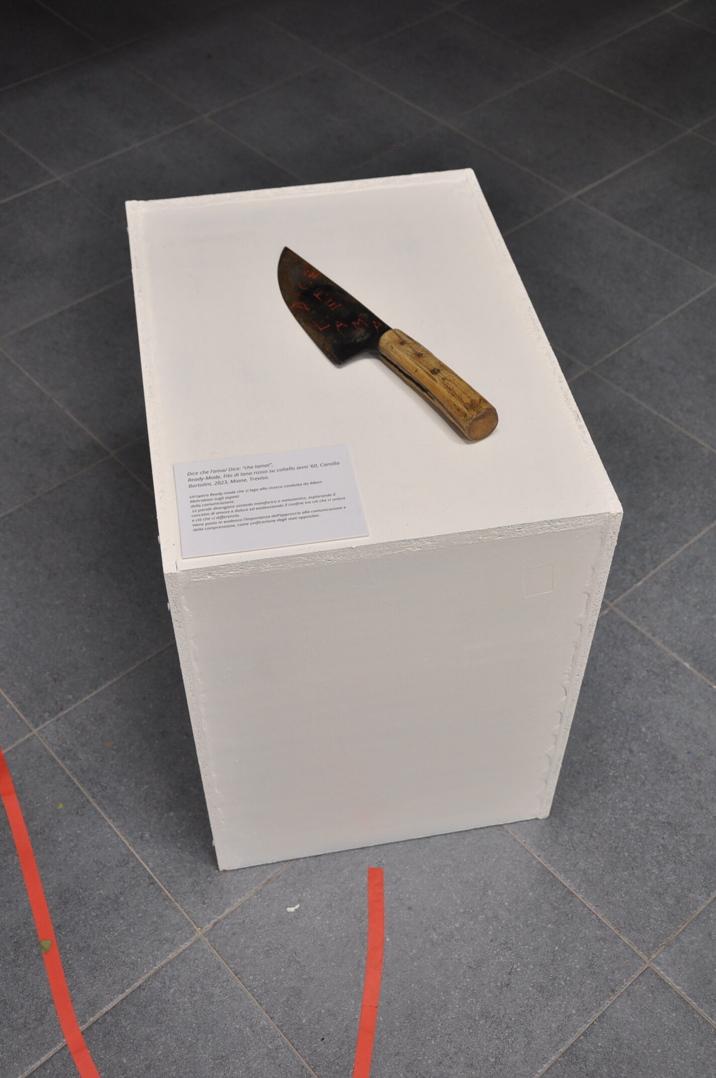 Coltello vintage anni ’60 + filo di lana rosso (opera esposta durante la mostra “Povera Carne Che Non Mangia Carne” nello spazio espositivo Artilaide a Gallarate nel 2023).